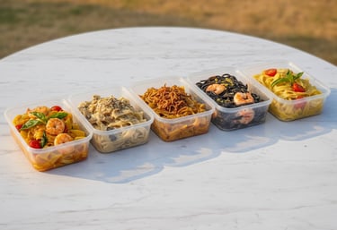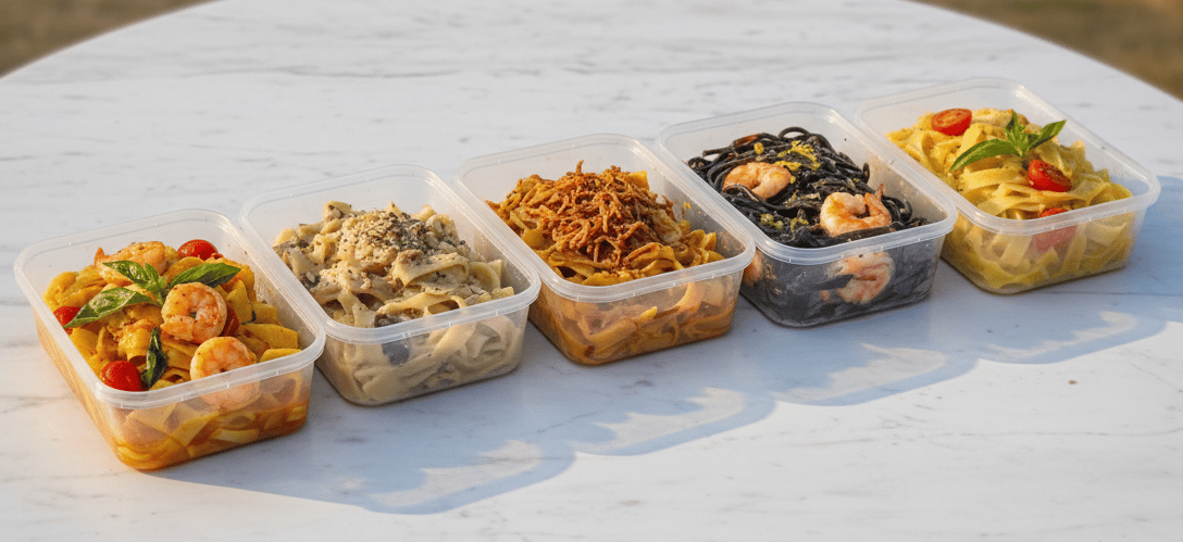 Nossas massas artesanais são entregues em potes práticos e seguros. Você pode aquecer diretamente no micro-ondas e consumir na hora ou congelar para depois. Simples assim!