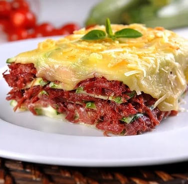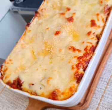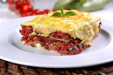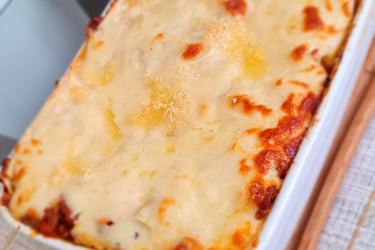 Tradicional lasanha de massa de espinafre, recheada com ragu à bolonhesa, camadas de molho bechamel, muçarela e parmesão.